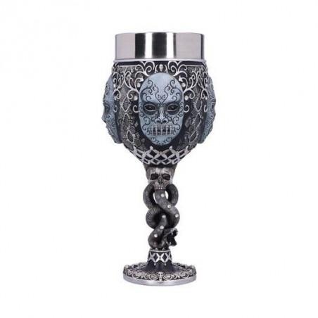 Fabricada con materiales de alta calidad, esta copa combina un diseño elegante con detalles fieles al mundo de Harry Potter. Su acabado oscuro y los símbolos de los Mortífagos grabados o impresos (según versión) hacen que cada sorbo o exhibición evoque la atmósfera de las fuerzas oscuras que desafiaron a Hogwarts.