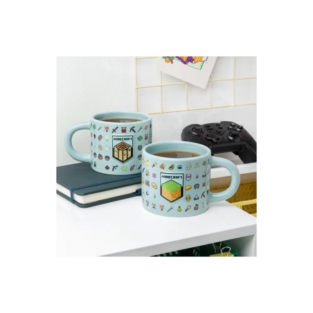 Esta gran taza de cerámica azul de 400 ml presenta detalles en relieve del Bloque del Artesano y el Bloque de la Tierra a ambos lados.